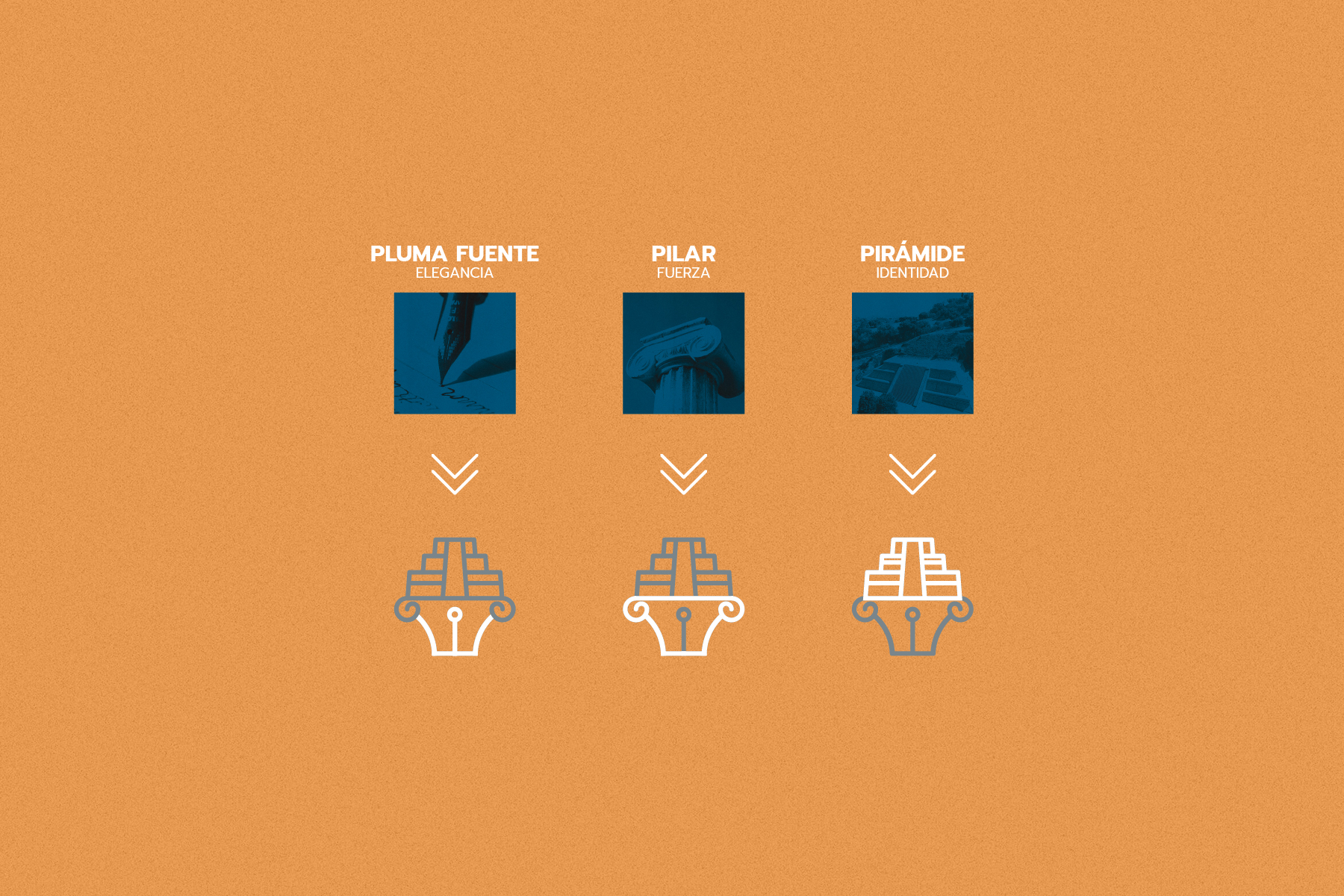 La imagen de esta marca une la pluma fuete para evocar elegancia, un pilar como referencia a la fuerza y la pirámide de Cholula para destacar identidad territorial, usamos colores blanco y azul para transmitir confianza.